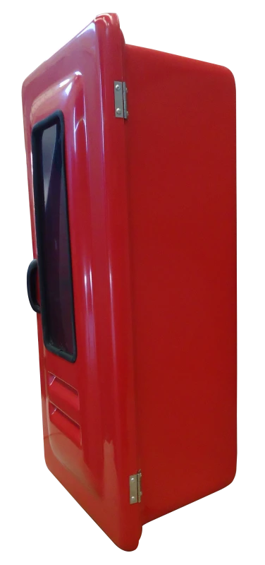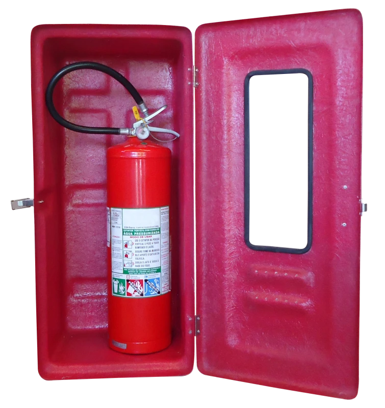 Outra opção de abrigo para extintor é o modelo em fibra de vidro (Fiberglass), o qual é pigmentado com Gel Coat vermelho, o que dispensa a pintura e reduz os efeitos dos raios ultravioleta sobre sua superfície. Durável e altamente resistente, o produto não corrói nem descasca.