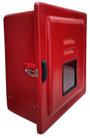 Os abrigos em fibra de vidro, para mangueiras, são próprios para ambientes corrosivos ou sob ação das intempéries. Fabricados com dobradiças e fechaduras em aço inox 304, fixados com rebites em alumínio, puxador em Poliamida + PRFV e visor de poliestireno cristal 1,5mm com perfil de borracha “S” para acabamento e vedação.