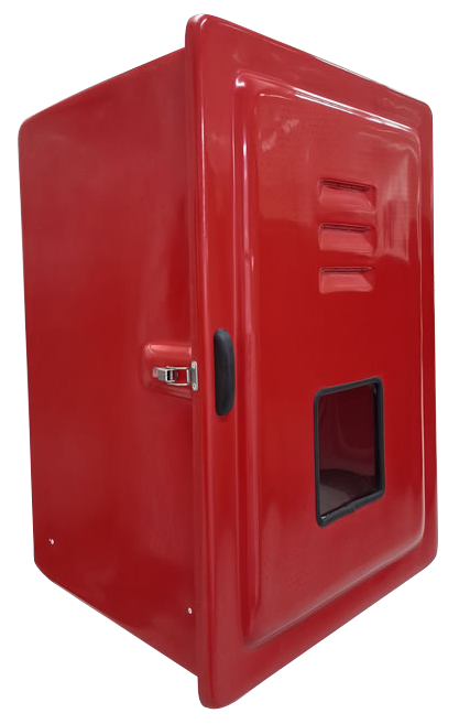Os abrigos em fibra de vidro, para mangueiras, são próprios para ambientes corrosivos ou sob ação das intempéries. Fabricados com dobradiças e fechaduras em aço inox 304, fixados com rebites em alumínio, puxador em Poliamida + PRFV e visor de poliestireno cristal 1,5mm com perfil de borracha “S” para acabamento e vedação.