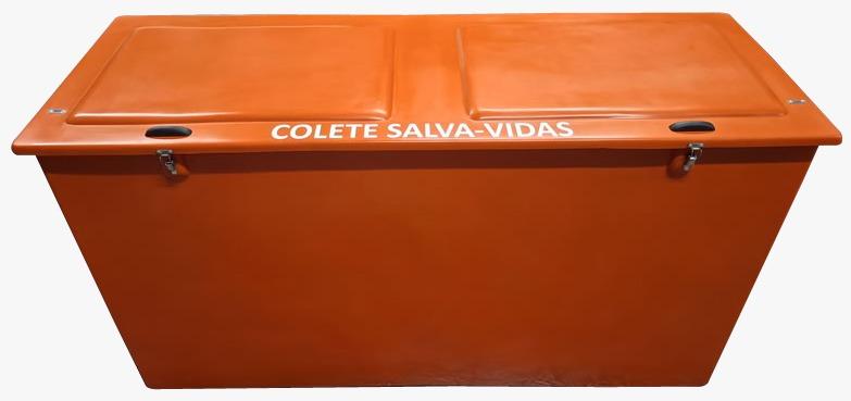 Baú em fibra de vidro, para coletes salva vidas, são próprios para ambientes corrosivos ou sob ação das intempéries. Fabricados com dobradiças e fechaduras em aço inox 304, fixados com rebites em alumínio, puxador em Poliamida + PRFV.